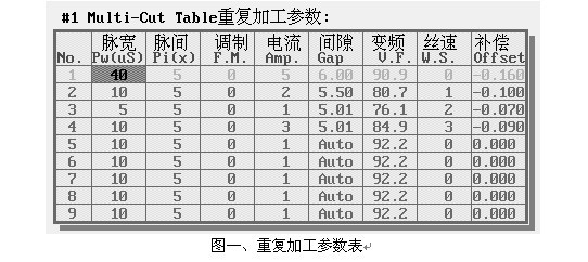 进入加工菜单、调入3B文件后,按F1键从起始段到终点段进行加工,系统提示: “Multiple重复加工次数:”,输入次数须大于2,否则作普通单次切割处理,如在TOWEDM中已作多次加工处理,按回车即可; “End len(mm or =seg)终段长(=段):”,输入最后一刀的预留长度(单位:mm),在输入数字前加“=”号,则表示预留的指令段数; “End cut 1 time?终段1次?Y/N”,如输入Y,预留段一次割完;如输入N,按前面输入的加工次数对预留段作多次切割,在对预留段作多次切割前,系统会暂停,以便用户将工件已割部分固定好。 “Offset,,,补偿值,,,:”,输入多次切割的各次补偿值(单位:mm),以“,”分隔,该系列补偿值可在“重复加工参数表”(图一)中预先输入。如预留段选择了一次割完,会要求输入比切割次数多一个的补偿值。 这里输入的补偿值是产生3B程序时所输入的补偿值的叠加,但与“加工参数设置”(第4页)中的“Offset补偿值”无关。