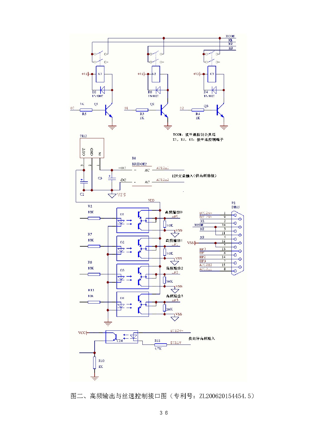[注意3]:DC12V+、DC12V-是用于换向停高频,当这两脚之间有一个12V直流电压输入时,高频开启,无电压时,高频关闭(即HF0、HF1、HF2、HF3均无高频信号输出)。可将步进驱动电源电压经换向停高频触点接入。