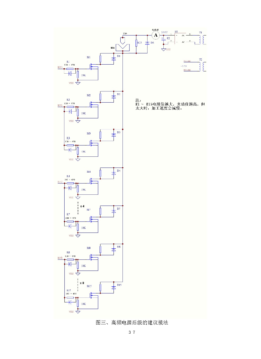 [注意2]:AC12H1、AC12H2是为高频信号提供~12V交流工作电源,必须由独立的变压器提供,或从高频变压器抽头提供。必须保证有~12V的电压值,可测量U23(7812)的输出有没有12V直流,否则,场效应功率管的栅极电压会不够而导致高频工作不正常。