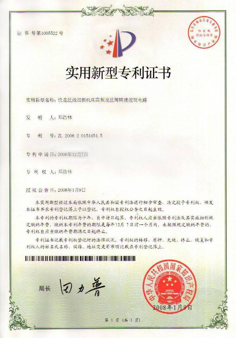 《HL线切割控制编程系统》、《Towedm线切割编程系统》、《HL线切割控制卡》、《HL高频及丝速控制电路》、《HL线切割控制卡产品设计》和《HL商标》分别取得多项中华人民共和国国家知识产权局发明专利、中华人民共和国国家版权局著作权和国家工商行政管理总局商标登记。任何单位或个人未经许可,均不得进行复制、翻版,或部分复制、翻版专利登记保护的内容。任何单位或个人销售或者使用复制、翻版或假冒HL产品,都将会受到法律的制裁。